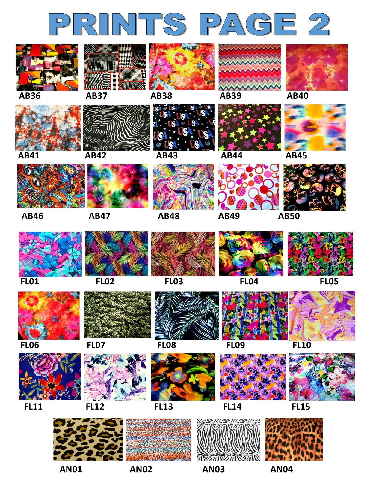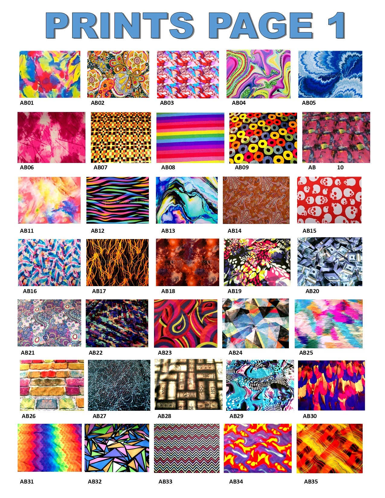 This page is only to show you what is available in prints ,solid colors, and sheers, when customizing your swimwear. On each product page you can scroll over the print images to see them enlarged. Then you can make your selection from the dropdown menus for each item you are ordering, which includes the custom choices for your garment, prints and colors.
